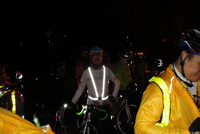 時間一到,鳴槍出發,大家陸續前進,由於我們排在前面,於是跟著前導車,下滑鯉魚潭,一直跟在前導車後面的領先集團,自我安慰一番,我們也在領先集團中....到達平地後,前導車離開,那些外星人一下子就看不見了。 Hank 開始組隊輪車,大家一路輪車,時速還有30KM真的還蠻快的,由於道路施工,外加天色昏暗, Hank 顧著掌握輪車及隊伍,沒看清楚路邊高低不平,所以摔車了,所幸並無大礙。隊伍又再度集結,繼續輪車,速度頗快,一直到要進入 193前的爬坡,因為無法輪車而做罷。大家率續前進, 193上上下下,也真的是辛苦,而無法集結。到了一個點,停下來喝水,才剛喝完, Hank 就趕著大家前進,因為休息太久會冷掉,就很不好。