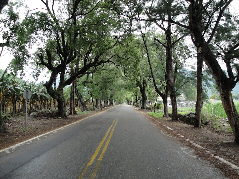 可能是騎太少了,Hank 一路狂飆,把我們甩得遠遠的,雨中騎車,在一片廣闊的平原,翠綠的稻田,清新的空氣,還真別有一番心情。登山車還真是重,不過當作是練車,外加風景美麗,也就不用太在意了。一路騎到台九支線的綠色隧道,這就是 Hank 說的景點,還真是漂亮。