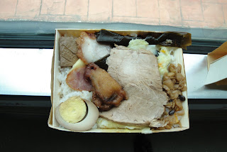 一直到池上,錯過了買便當,當火車一靠關山站,我只聽到 Hank 要去買便當,就衝下列車,到另一個月台去買關山便當,然後又衝回來,心裡還真擔心如果趕不上火車怎麼辦,飛毛腿的 Hank 不是叫假的,便當買回來,火車還沒開動呢。下面就是 Hank辛苦買回來的便當。
