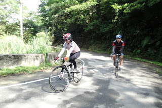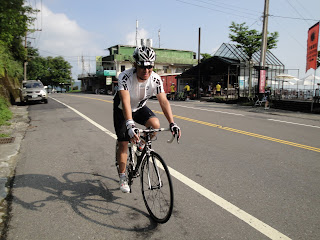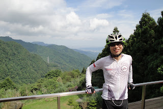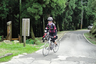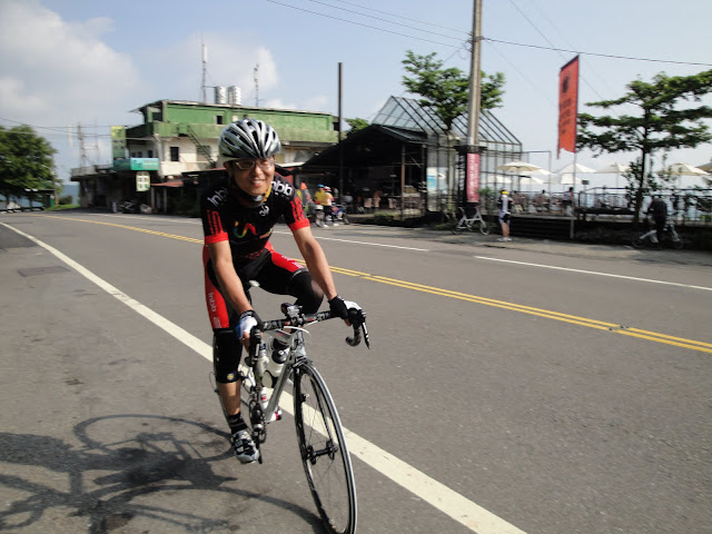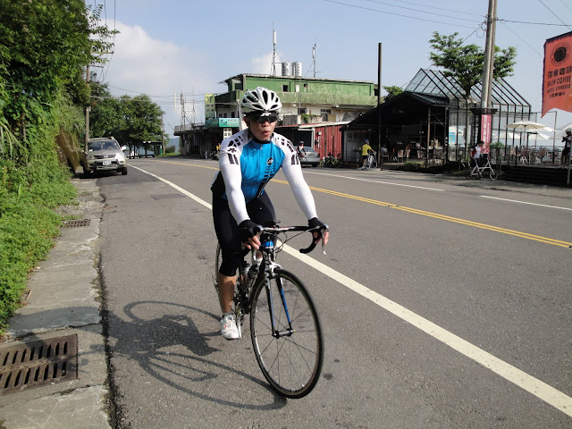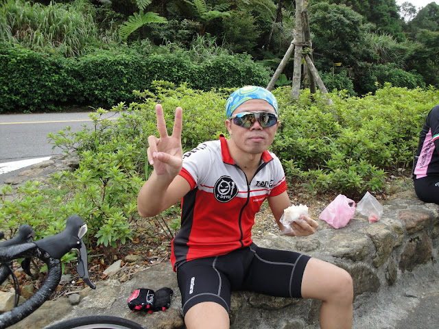 一路上,大家很客氣,都慢慢騎,天氣好,又騎在林蔭間,真是舒服啊。一路順騎,本來想下來拍照,但是又怕上不了車,於是作罷。一直騎到快接近熊空了,忽然爆心跳,有點喘不過氣的感覺,外加路面濕滑,抽車時輪胎滑了半圈,趕緊脫卡下車,還真是驚險,差點又摔車了。老實說,好久沒有爆心跳的感覺了,今天又是順順騎,不知為何會這樣,越來越虛了,傷腦筋。只好在旁休息喘口大氣,順便補水。沒多久,Nick 跟嫂夫人就趕到,差點來不及拿出相機照相,像一陣風一下就過去了,還好有抓到兩張。