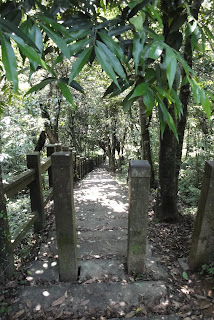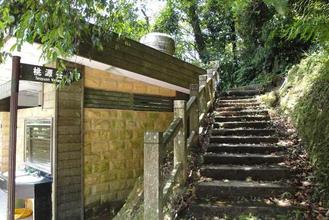 心裡很納悶,史教官的照片不是這種階梯阿,指標上還寫著要 1.1km 才到桃源谷,怎麼辦,入寶山豈可空手而回,只好扛起車,一步一步往上爬。途中有山友下山,看到我扛著腳踏車要上去,還問我,你真的要扛上去喔,很遠喔,我點點頭,繼續往上爬,不到50公尺就下車休息了,好累,比騎車爬坡還累,真是自找的,誰叫我史教官的路線圖不看清楚,這裡收訊不良,無法上網再看看,也無法上噗浪問,好慘。