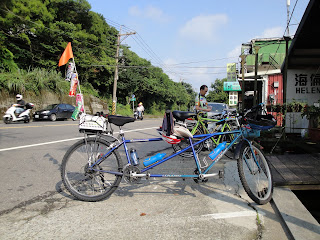 大家依照自己的步伐,努力往上爬,來到小格頭,忽然看到一台協力車,一對夫妻騎上來,也轉上海倫,心想,真是猛阿。腿力要很夠才行,在海倫徵求車主同意,照了張相片。