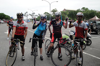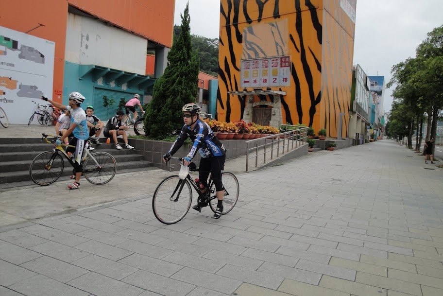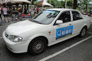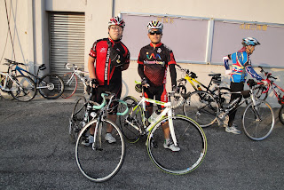 雖然時間還早,但是看到不少車友經過,原來是去參加小4P的比賽,大家真是為了騎車,不用睡覺就是了。沒多久,Jay 跟小高大哥陸續到來,也來了一位櫻桃小蛋,要去陪騎,哇,大家還在猜小蛋會不會出現,就看到小蛋騎著車出現了。大家把腳踏車裝上汽車後就出發往苗栗縣立體育場。