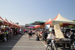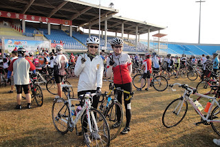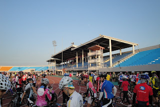 路上也陸續看到不少汽車載著腳踏車,想必也是去參加苗栗的活動,就這樣一路由天黑到天亮,已經到達了苗栗縣立體育場,車友陸續到達,大家組車試車,準備就緒後,就由小高大哥去幫大家報到,有人去吃早餐,我跟Ken 已經吃過,就在會場等待阿圓的到達。