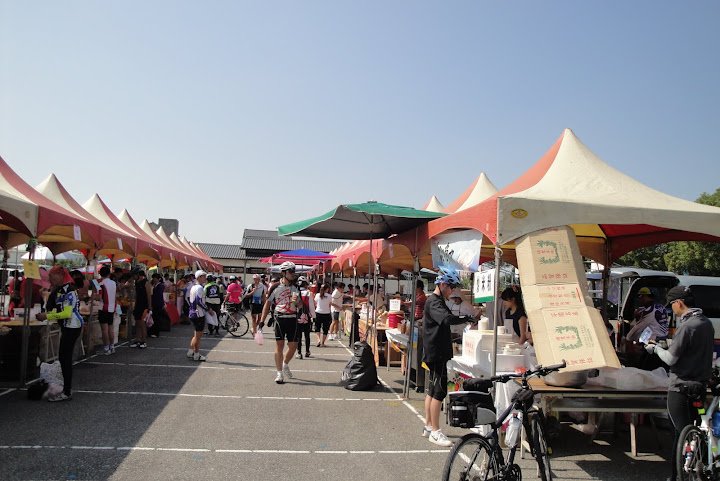 還好腿痠是痠,還沒有抽筋,於是努力往上爬坡,經過高速公路的苗栗交流道後,一路下滑,蠻長的,好爽。轉過彎,有一處補水站,以為要蓋章,所以停了下來,後來工作人員說這裡只補水,沒蓋章,看看水壺,還有一整瓶的水,應該是不需要補水,於是繼續找兔子,一起前進。終於來到第一個休息點,蓋完章後每人只能領一份補給品(香蕉跟客家菜圃),好可惜喔,還蠻好吃的說。這時,Jay 早已在此休息,Ken 隨後趕到,他說腿抽筋了,我就先噴了撒隆帕斯,然後整罐給Ken預防他抽筋要噴。