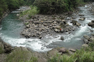小雷打破了他休假就下雨的魔咒,超高興的哩!大家開始下滑回家,經過一處河流轉彎處,蠻漂亮的,就休息拍照。小王的龍頭怪怪的,也順便鎖緊。